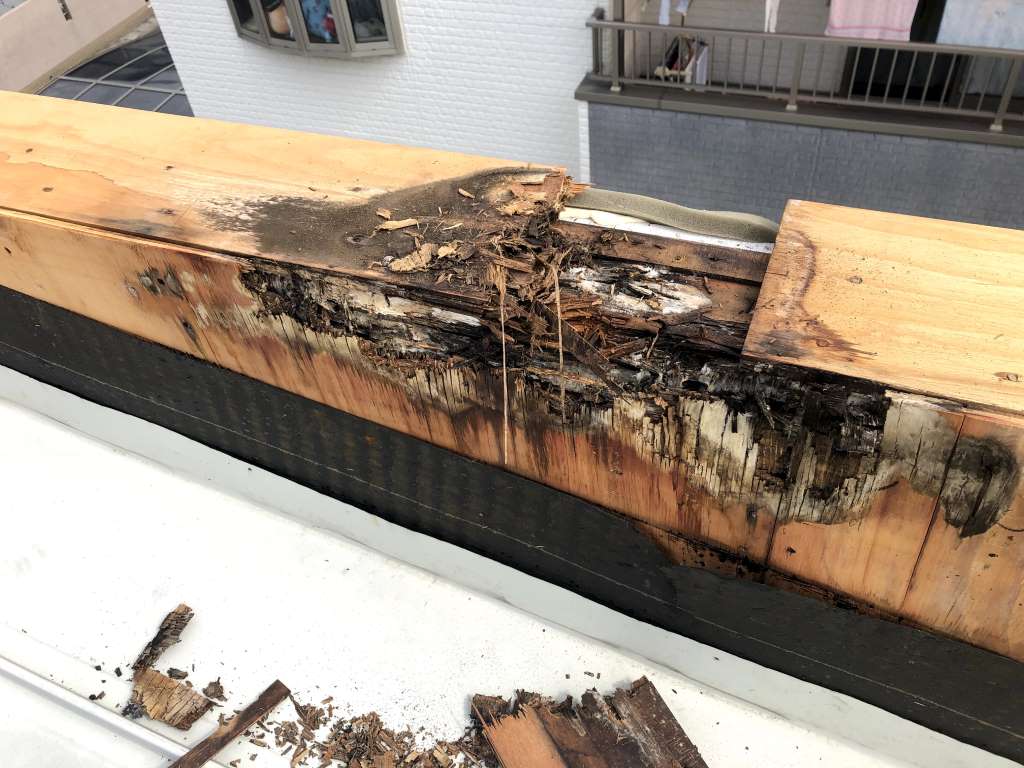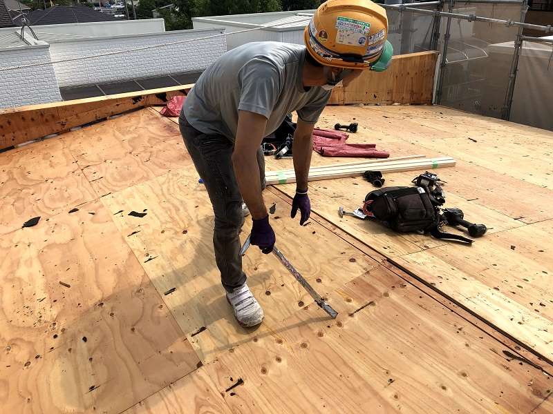 特に雨漏りが発生した屋根の葺き替えは、既存の屋根材を撤去して野地板(屋根下地の合板)を確認します。たぶん、多くの屋根職人さんは既存の屋根の上から施工するカバー工法を選択するはずです。今回も屋根のパラペット立ち上がりが腐朽(ふきゅう)していたので葺き替え時に修補しました。