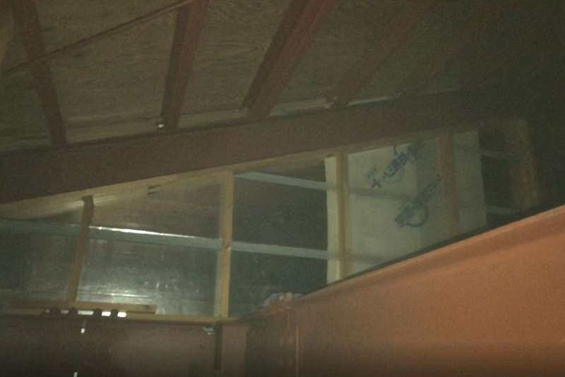 さて、小屋裏の話を戻すと・・・小屋裏から確認すると妙な違和感を感じました。写真の銀色部分は金属サイディングの裏側になり、室内から確認できるという事は透湿防水シートの施工がされていない事になりますが・・・写真右上に白い紙のようなものが・・・