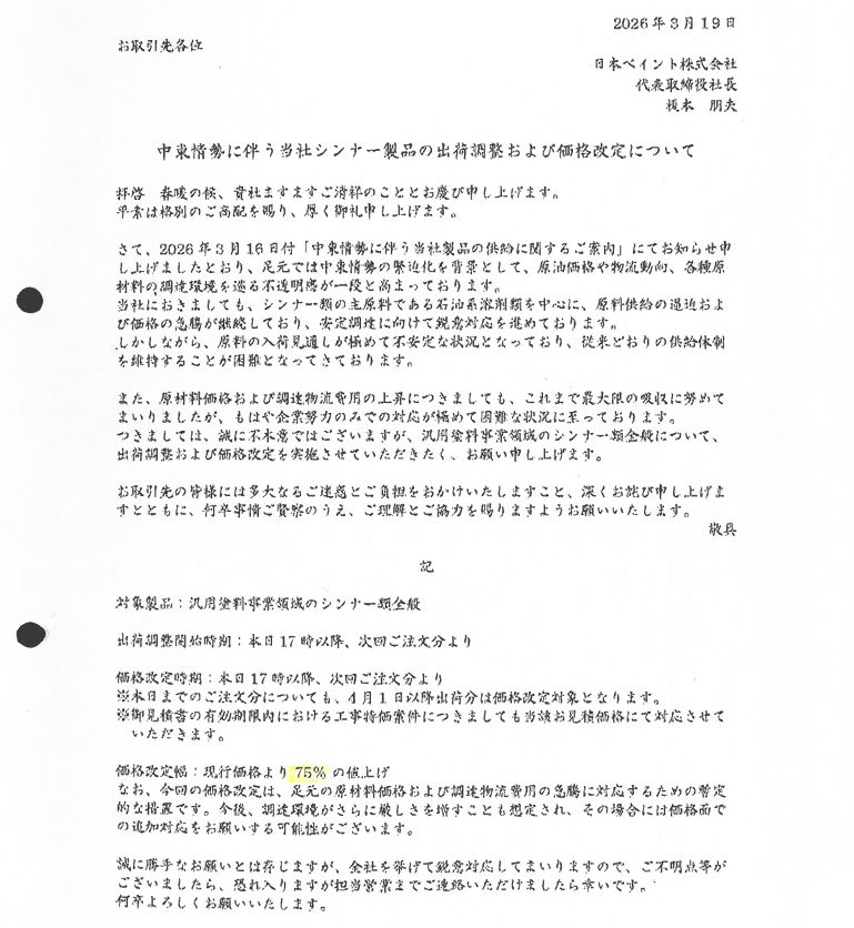 以下の画像は、3月19日に日本ペイントから届いたシンナー類75%値上げの通知です。