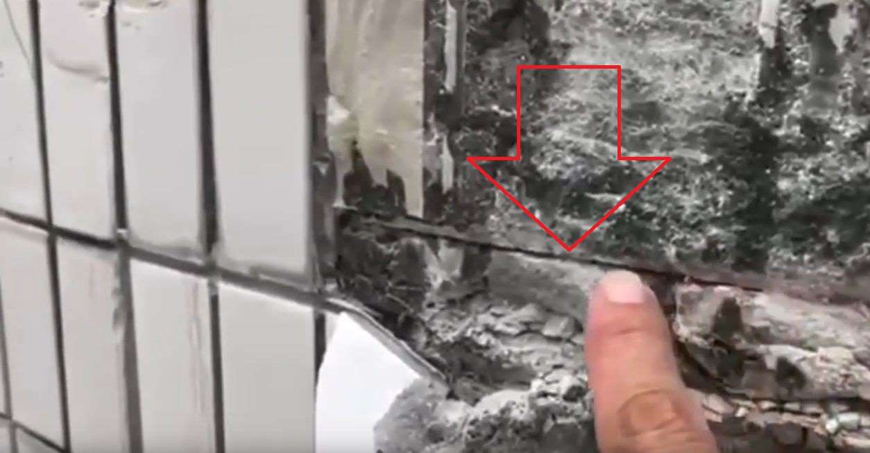 赤矢印部はタイルを撤去し内部壁に破断が確認された写真ですが、これほどの破断を抱えながらタイル壁面の防水材のみで10年以上持たせるのは、かなり難しいと考えられます。
