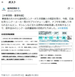 少し前にマスコミの報道により、6月にはナフサが枯渇するとの報道がありましたが、首相がXで報道を誤情報として否定しました。誤情報が広がると更なる混乱が広がるため、異例ともいえる発信です。