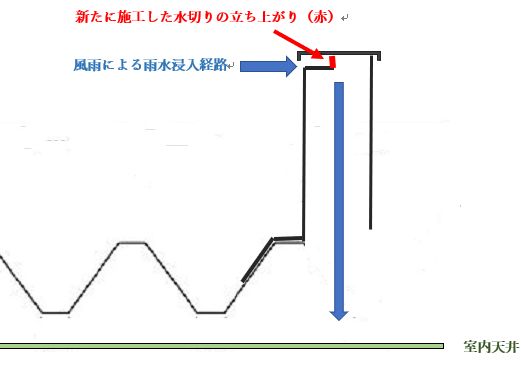 問題点は、シーリング内部を確認するとわかりました。壁の奥に折半屋根(立ち上がりの鋼板)を水平に差し込んでいるだけで水切りの立ち上がりは無く、シーリングが破断すると雨水は室内に浸入する納まりとなっていました。