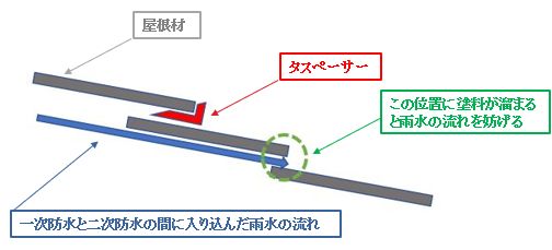 また、タスペーサーだけに頼るのではなく右上の写真のように、横方向に塗ることで屋根材の水の抜け道をふさがないように塗装します。この方法はタスペーサーが商品化される以前からの施工方法でタスペーサーと横塗りを併用する事で、施工が原因となる雨漏りを予防できます。
