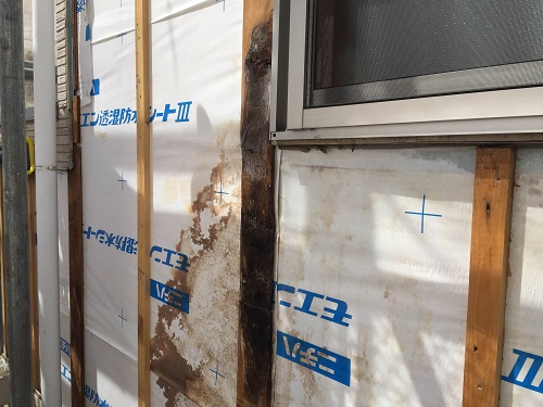 そこで、シーリングが破断しても胴縁が腐朽しないように、防腐剤注入胴縁が登場しました。 良いアイデアのように思えた防腐剤注入胴縁ですが、最近になって防腐剤と透湿防水シート(防水紙)の相性が悪いことがわかってきました。