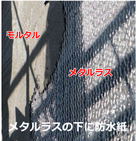 モルタル壁は、モルタルの下にメタルラスがあり、さらにその下に防水紙(フェルト)があります。この防水紙があることで、モルタル表面にクラックがあっても、雨水が流下する構造になっていて、雨漏りを防いでいますs。