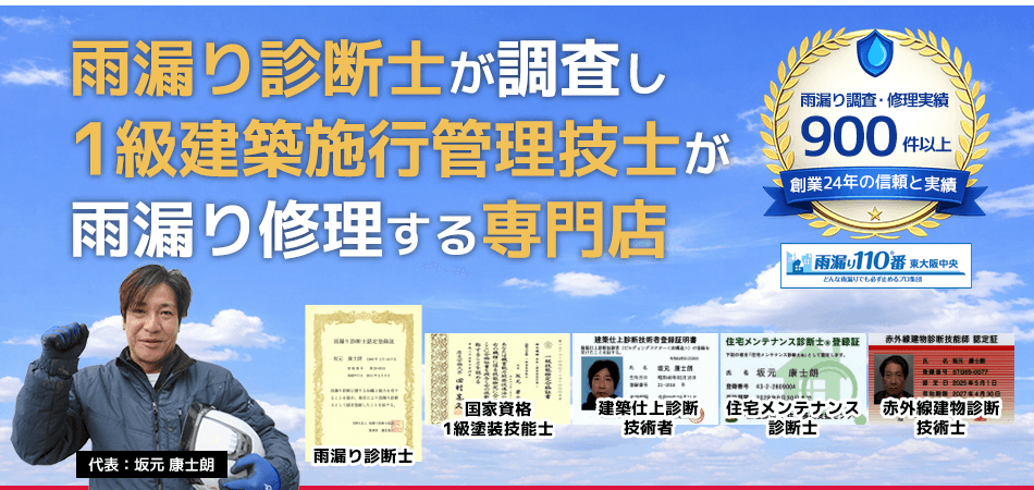 グラス・サラは、雨漏り診断士の資格を保有している会社の中でも、難しい雨漏り現場の経験を積んだ会社が加盟できる「雨漏り110番」に加盟しています。本部より認められ指名を受けた、いわば雨漏りのエキスパート集団です。